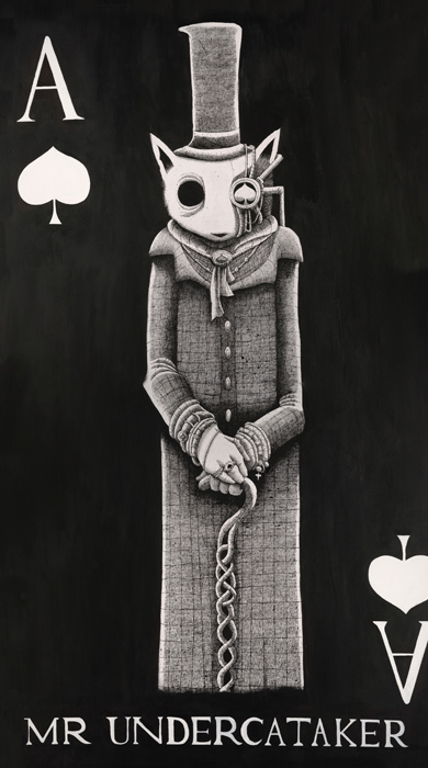 Mr Mead has produced a new edition of playing cards, with each card in the pack adorned with one of his ‘Bio-mechanical anthropomorphic’ characters. The characters are grouped by family into the four suits, Birds adopt the Hearts, Horned Beasts the Diamonds, Cats the Spades and Foxes the Clubs.” ~ Antlers Gallery