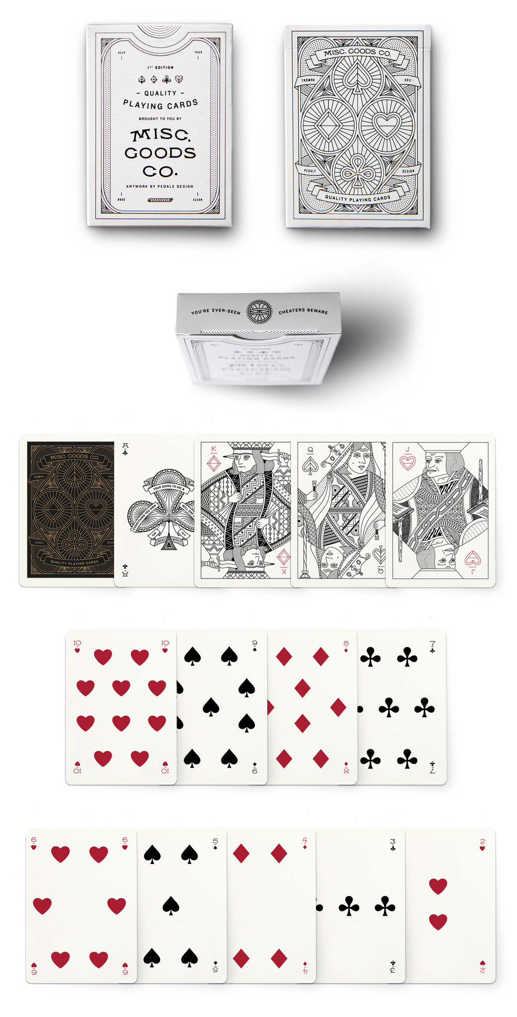 A Deck of Playing Cards by Pedale Design was designed by Tyler Deeb (Pedale Design). It was successfully funded on Kickstarter. It’s a limited edition run of 10,000 decks. The deck sequentially numbered and will never be reproduced. Playing cards are in a white tuck case (black ink / emboss / gold and black backs).