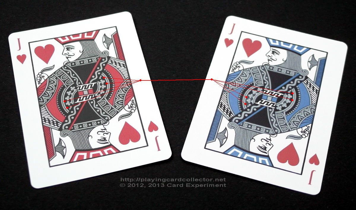 Pay your attention to details made with silver metallic ink on the Jack of Hearts (and some other court cards from Bicycle Asura Metallic Blue deck). You can see some mistakes of printing mentioned on this blog before. So this is an unpleasant diagnosis – USPCC can’t properly print those small details with metallic ink. And it is really strange taking into account backs from this blue deck made with blue and silver metallic inks. Bicycle Asura Red deck doesn’t use metallic ink for those design elements and doesn’t have the problems. Clickable