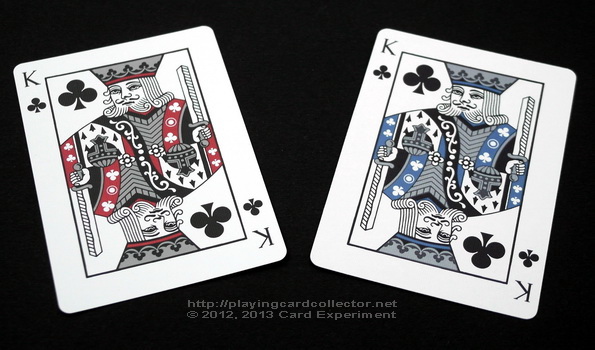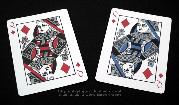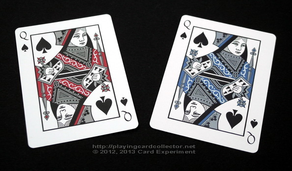Court cards in both decks are recoloured Bicycle standard court cards. Bicycle Asura Red deck used red metallic ink. Bicycle Asura Metallic Blue deck used blue and silver metallic inks.