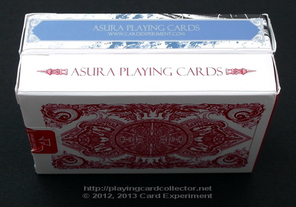 In case of Bicycle Asura Red deck metallic inks were used only for playing cards. In case of Bicycle Asura Metallic Blue deck Card Experiment decided to use them for tuck cases as well.