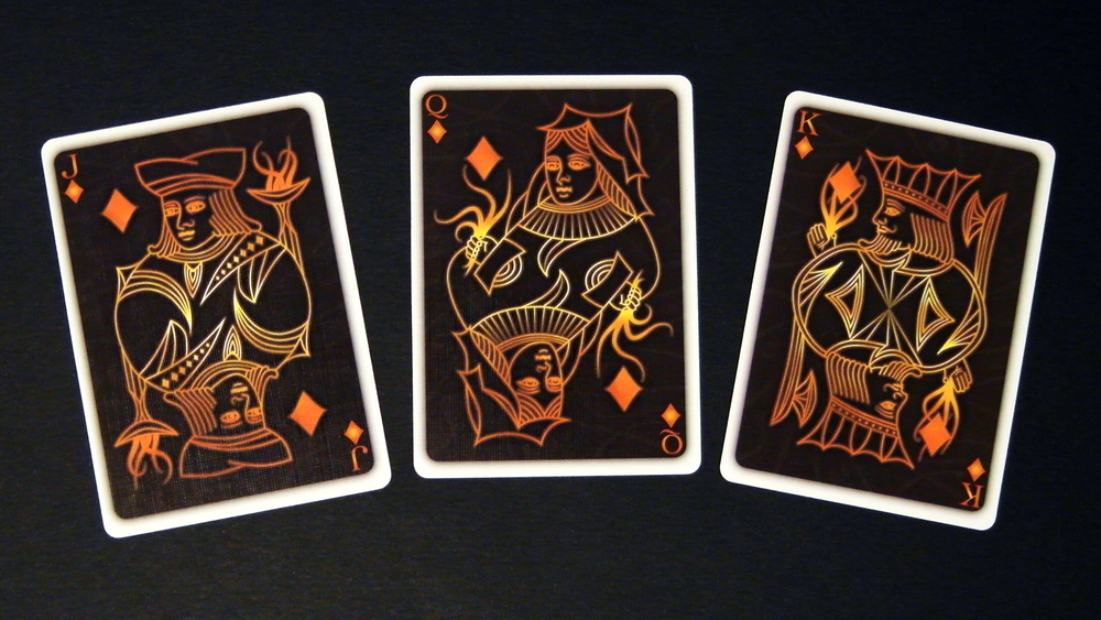 - Custom indexes, pip design, court cards: Every element of Tendril has been drawn from scratch. The court pays homage to the Bicycle court, but in a simplified “bas relief” style with dramatic coloring.