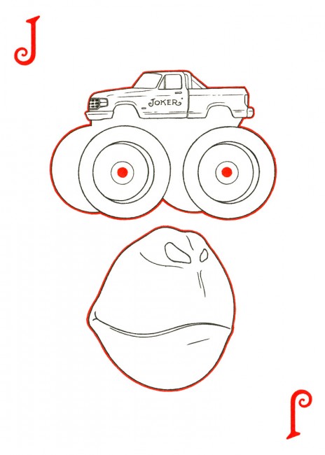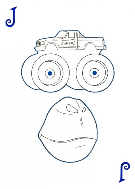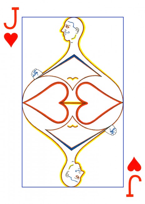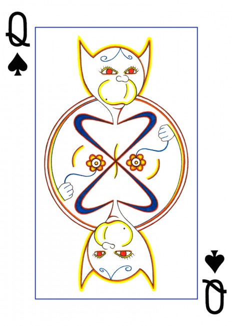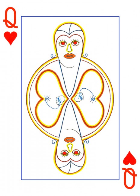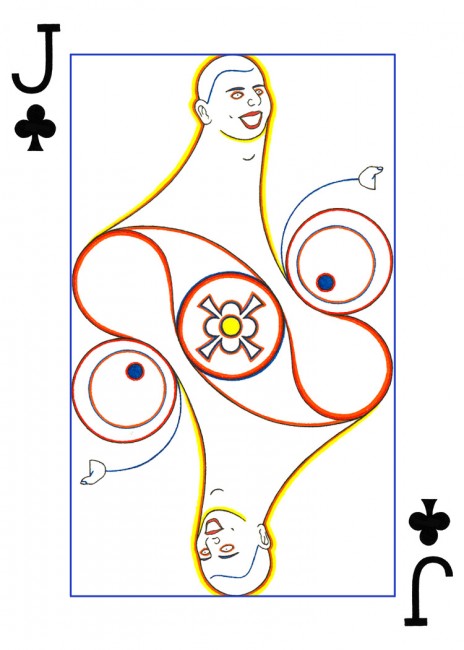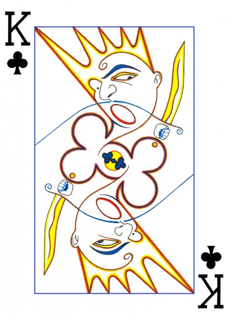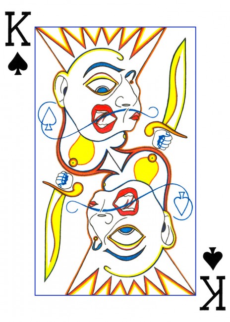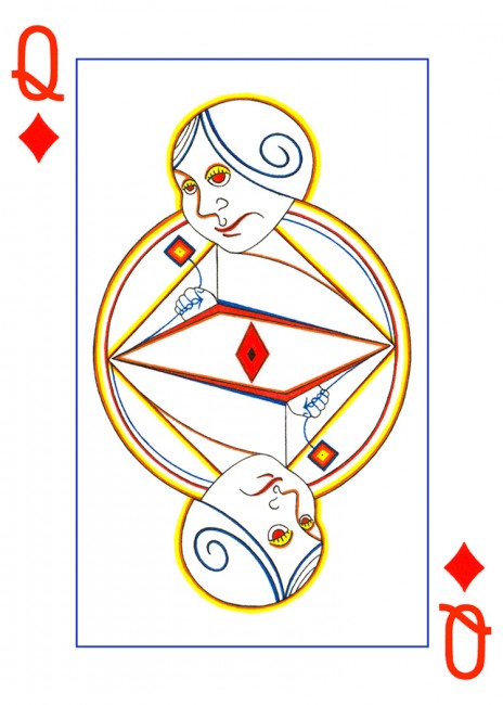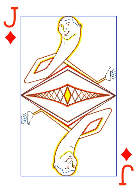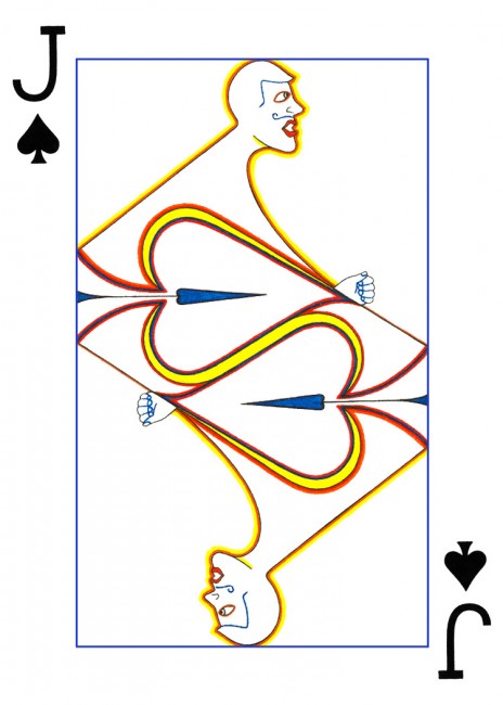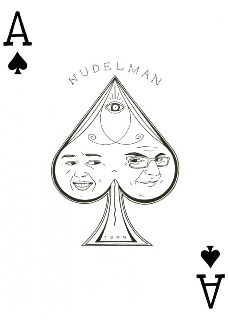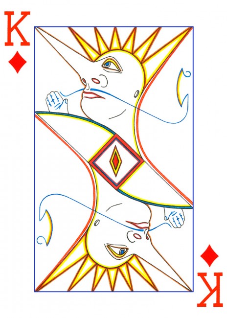 “A series of playing card face drawings, inspired by the traditional Bicycle Rider Back design. All were made with pen and marker on 8″ x 10″ paper.” ~ © Mike Nudleman.
