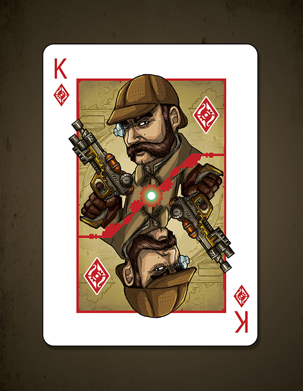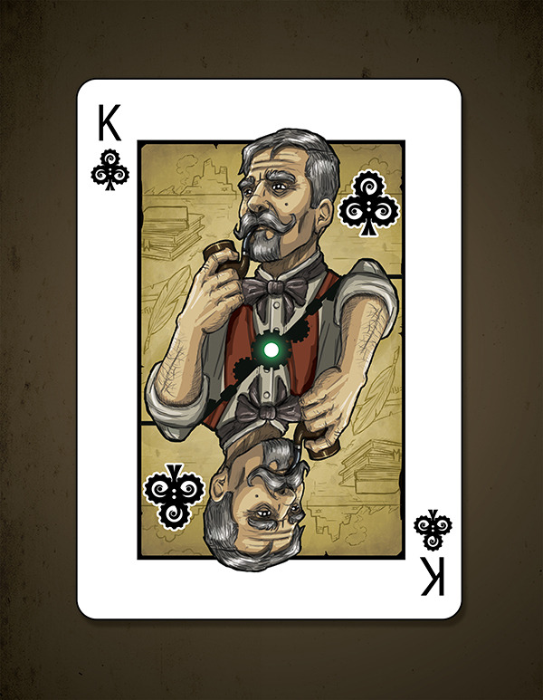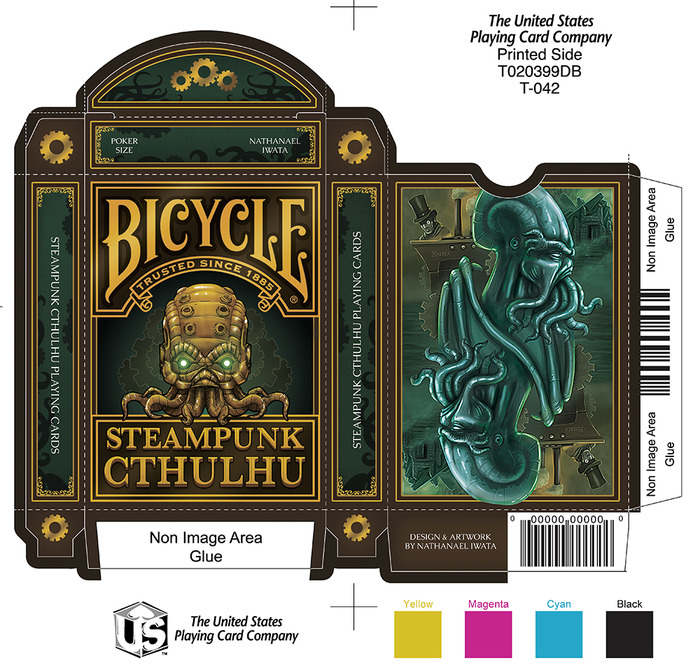 “Steampunk and Cthulhu have joined forces to grace the surface of a custom deck of poker sized playing cards. This unique combination has led to some kickin’ art. Featured on the back of each card in the deck is the mighty Cthulhu himself at the center, with scenes from the story in the background, all with a Steampunk twist. Court cards will show characters from the story, and possibly the faces of a few generous backers.” ~ Nat Iwata