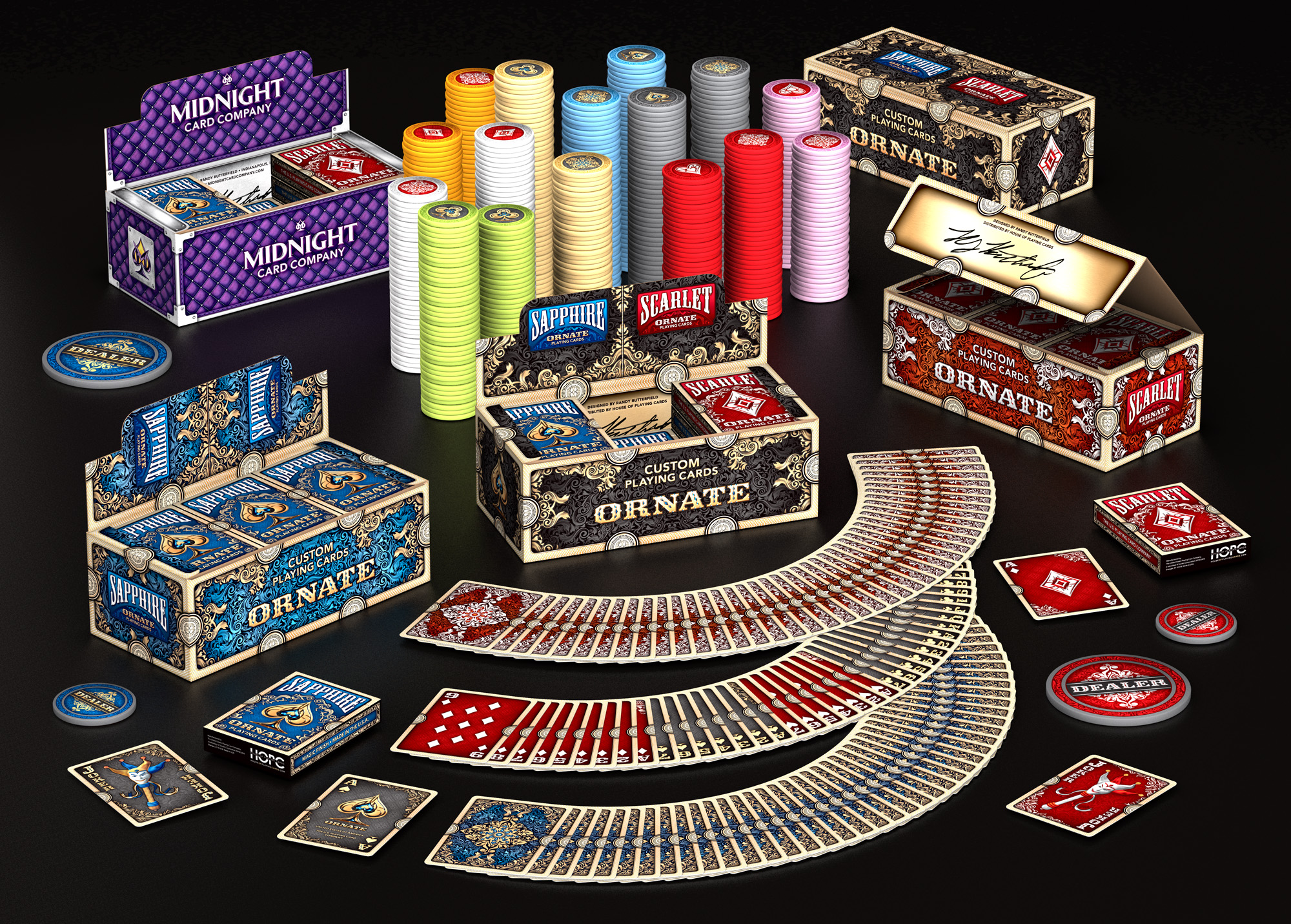 This set of decks is designed by Randy Butterfield (Midnight Cards). It’s produced by Midnight Cards in cooperation with the House of Playing Cards (HOPC). The decks printed by USPCC. They were sold on HOPC.