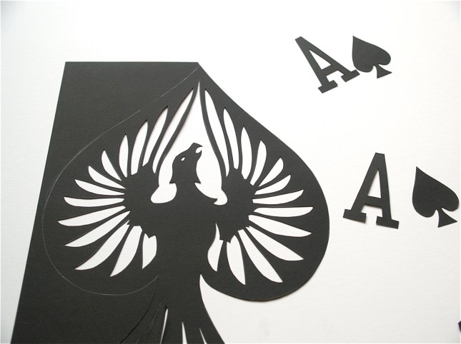 Using papercutting techniques, Emmanuel follows a centuries-old tradition of transforming the suits and pips of a standard deck of playing cards.