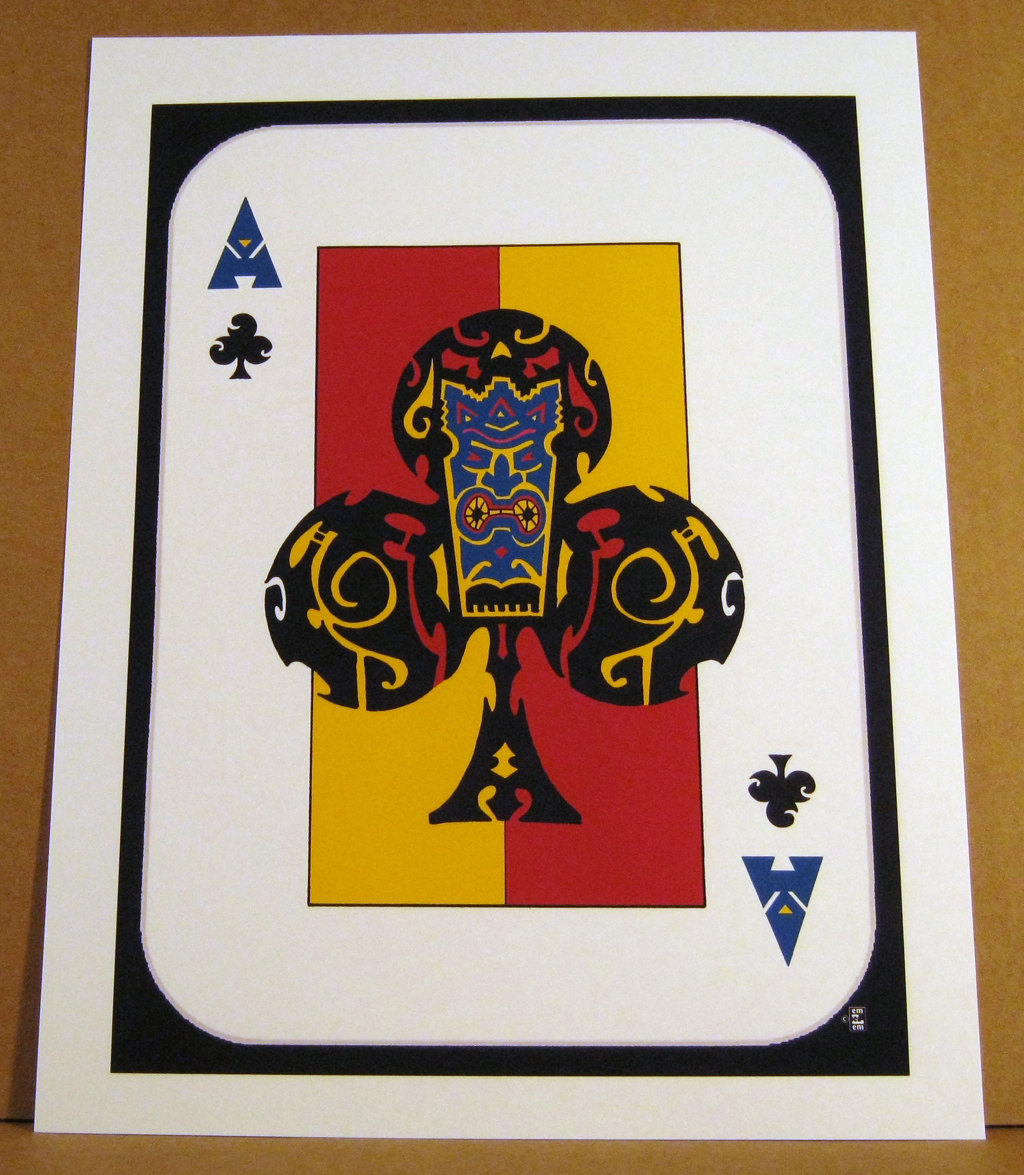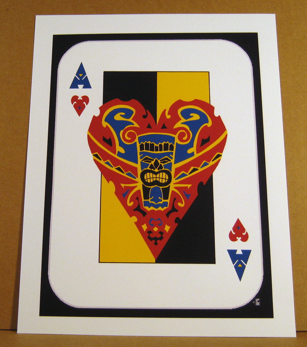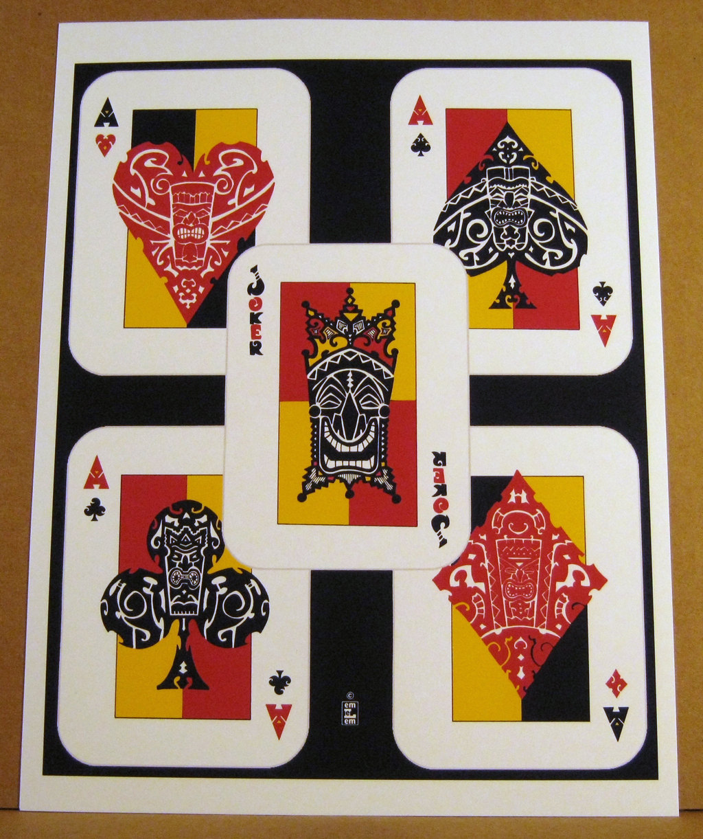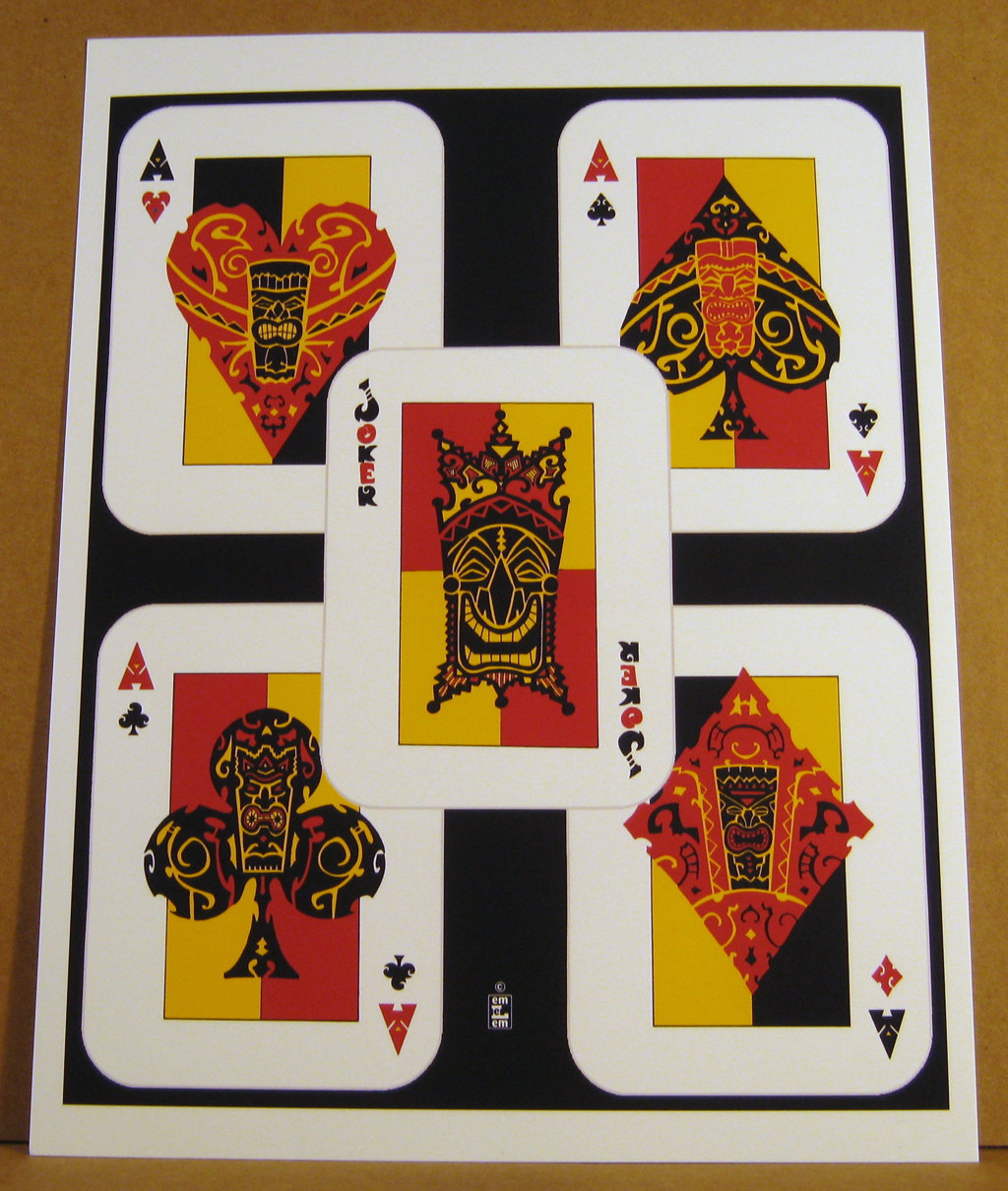 Tiki Series of digital art prints by Michael L. Marland. Digitally-colored drawings using a combination of tiki images and playing card art.