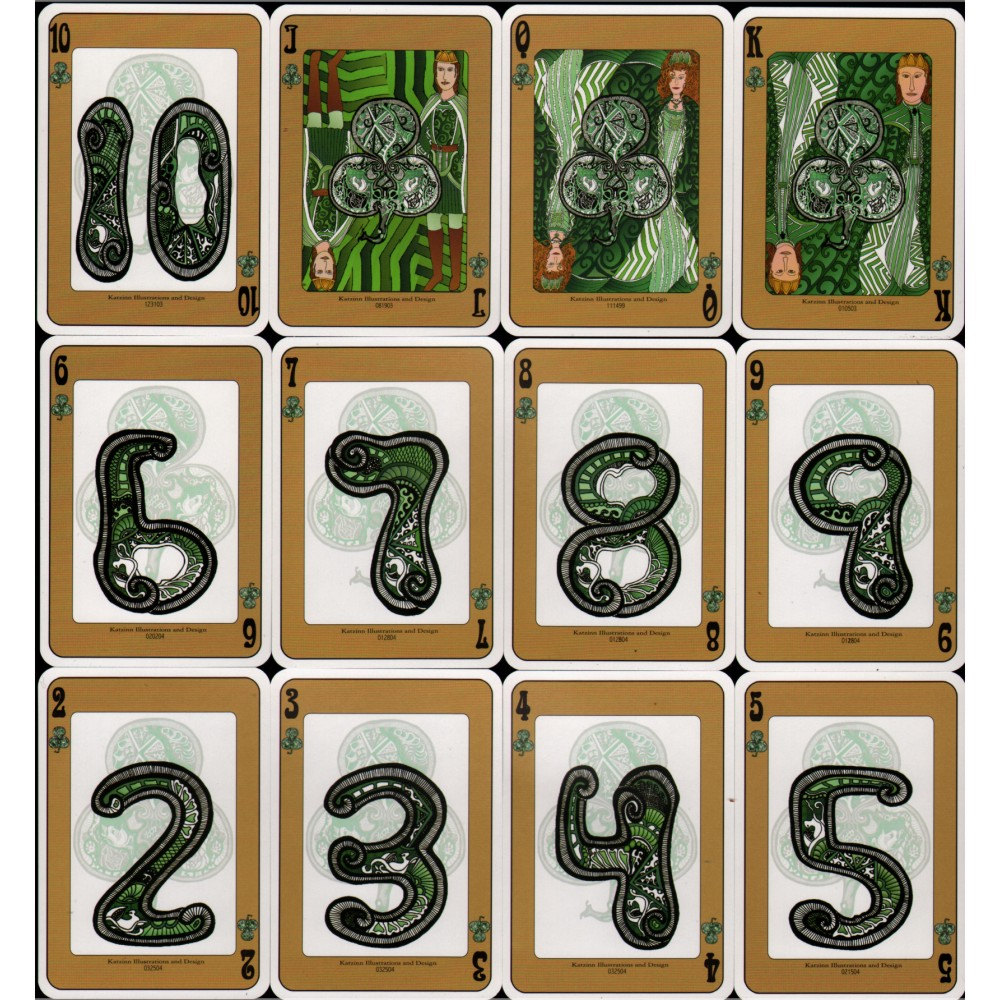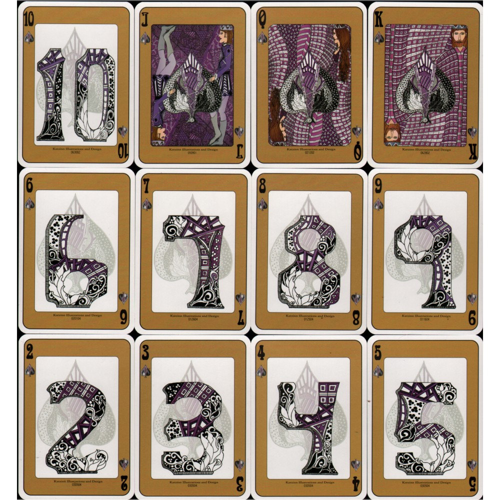 Kat Zinn designed this deck over a period of seven years. She decided to diversify this deck and she made a Joker and a Joketress instead of two traditional Jokers. There are also appropriate drawn numbers against the background with big pips on all number cards instead of traditional pips.These playing cards are slightly larger than standard poker size. The deck printed “by the manufacturer of Aviator playing cards”.