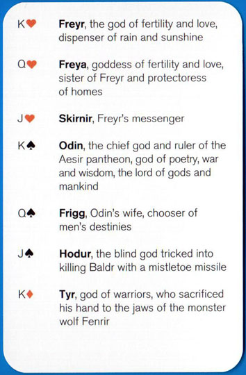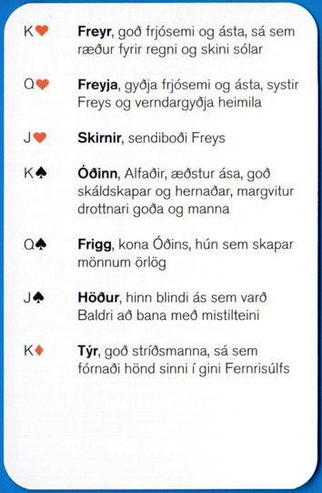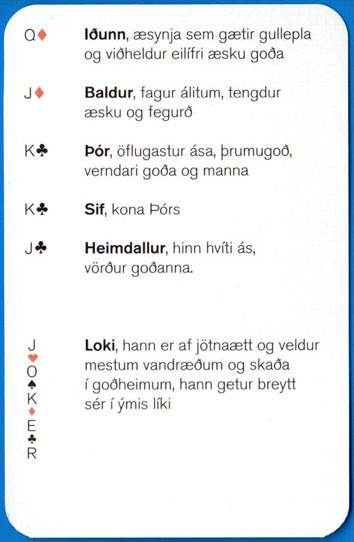 Court cards feature Nordic gods instead of royalty – “The Vikings who first settled Iceland were pagans. They left kingdoms in Norway and brought with them their belief in the old Nordic gods. Because they worshipped several deities but had no king, this distinctly Icelandic deck of cards features Nordic gods instead of royalty“.