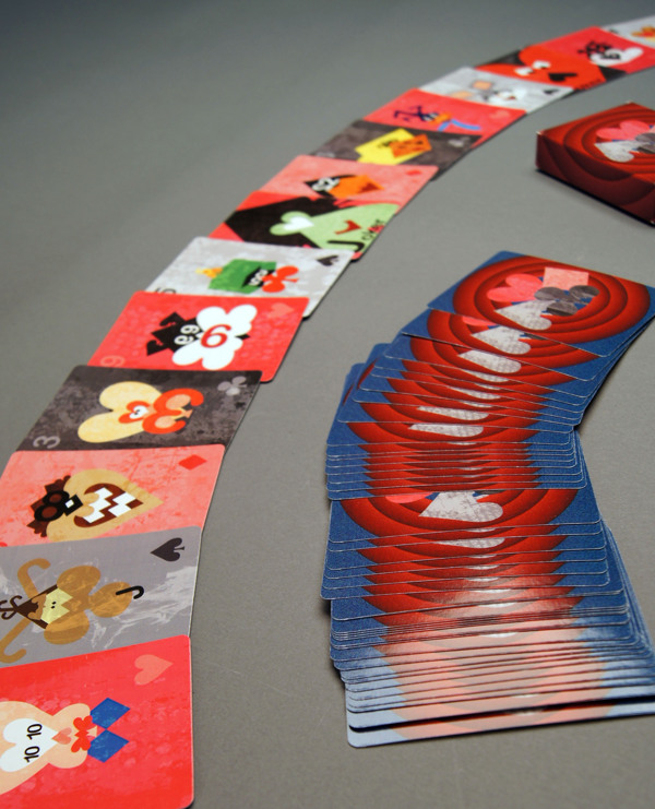 Laura Moskal designed these playing cards on the basis of Looney Tunes characters using the four playing card symbols: heart, diamond, spade, and club. Each number or letter in the deck has a character assigned to it as well as a different texture. She used pinks and grays for this deck. All forms are in their natural shape. There was no skewing, stretching, or distorting in any of the designs. Designed for her design portfolio – Spring of 2011. Laura has only had one deck hand made.