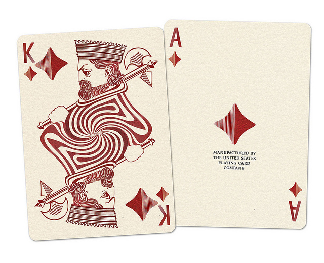 They are careful to make sure the pips and indicies are not only pleasing in their design layout, but that they are easy to read – so playing cards are playable. Uusi has kept all the traditional elements of the court cards most used in games such as poker: two one-eyed Jacks (Spades and Hearts), the “Suicide King” (Hearts, with sword “through” head) and the “Man with the Axe” (King of Diamonds). Also they created a signature Joker unique to the Royal Optik court.