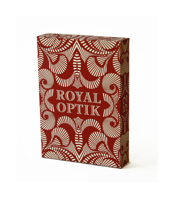 Royal Optik is an entirely custom deck of playing cards and the third deck in a planned, six deck series from Uusi (Peter Dunham and Linnea Gits).