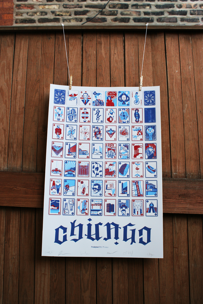 Chicago playing cards designed by the Double Blind Collective.They redesigned a traditional deck of playing cards to focus various Chicago landmarks, personalities and historical events. The cards focus on the unique aspects of the city rather than just the John Hancock or Sears Tower.