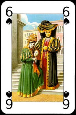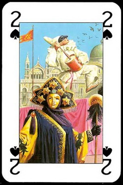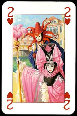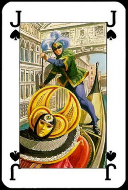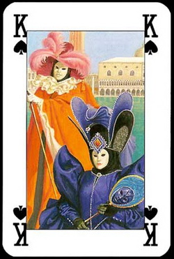 Playing cards are designed by Severino Baraldi. The deck is based on the Carnival of Venice theme. The Carnival of Venice is an annual festival which is held in Venice (Italy).