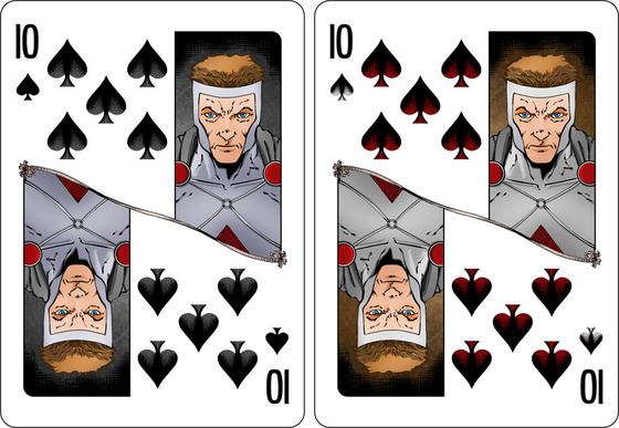 Bicycle Instruments of War Deck is designed by Jacob Bear and Bear Claw Studios. The deck dedicated to comics figures. 56 different cards – even number cards have artworks. It’s planned to be printed by the USPCC.