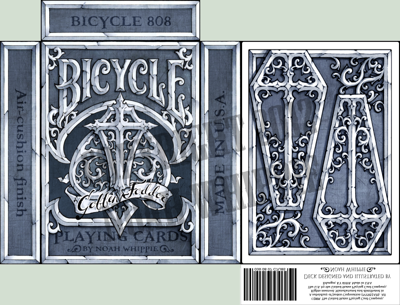 1. Bicycle Coffin Fodder deck are designed by Noah Wippie and are available for purchase (Google will help). Poker size. Limited edition: 2500 decks. Printed by USPCC (Bicycle stock, Air-Cushion finish).