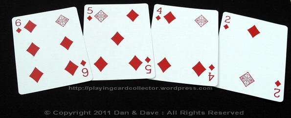 All number cards have one custom pip which repeats the design of the appropriate ace (Spades – The Ace of Spades, Hearts – The Ace of Hearts, Clubs – The Ace of Clubs, Diamonds – The Ace of Diamonds).