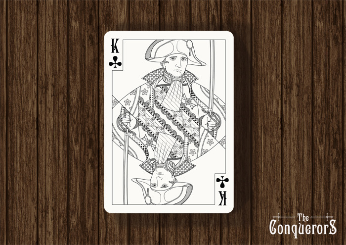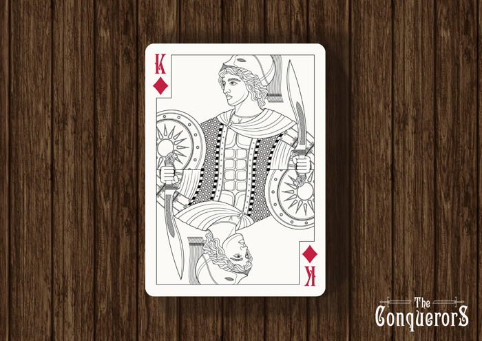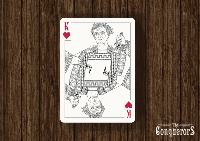 My modest opinion (due to the lack of the normal description of this project – conquerors even are not mentioned by name): I think Sin Cards designs pictures much better than explain them. You will not find any sins of conquerors on these playing cards but you will find conquerors themselves on them. Even on The King of Hearts you will find sins of other people but not sins of the conqueror.