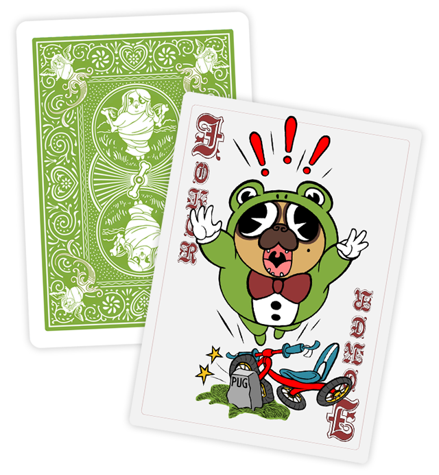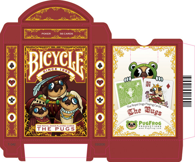 Bicycle The Royal Dogs Playing Cards: The Pugs is a custom deck of poker-sized playing cards. Designed by a lads at PugFrog Publications. These fun and whimsical cards depicts the antics of a plethora of lovable pugs. These are planned to be printed by USPCC.