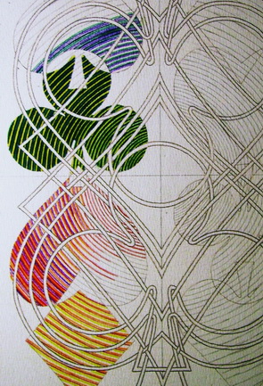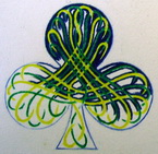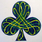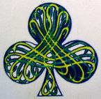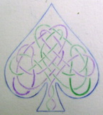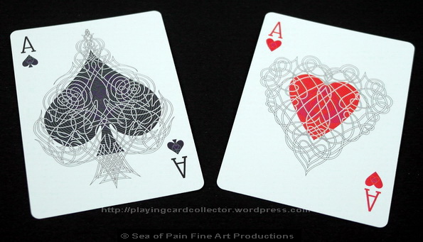 The cardback had to be diagonally symmetrical but have all the design features and all the suit symbols incorporated. First designed a white celtic knot comprised of two of each of the suit symbols all interlocked, overlapping and vertically and horizontally symmetrical. Then quartered the card (inside the white border) and made the four corners diagonally symmetrical with deep red for the two red suits and dark indigo blue for the two black suits.
