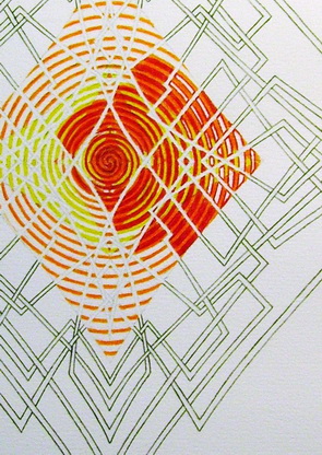 He then ran four overlapping suit symbols down each side, red suits in the red corners, black suits in the indigo blue corners. A spiral runs through and each suit symbols secondary and tertiary colours to pick their shapes out of the background colour, like you are looking through the spiral into the red and indigo blue. This put the same subtle tinge to the various suits that they display on the actual deck and allowed him to go another layer deep.