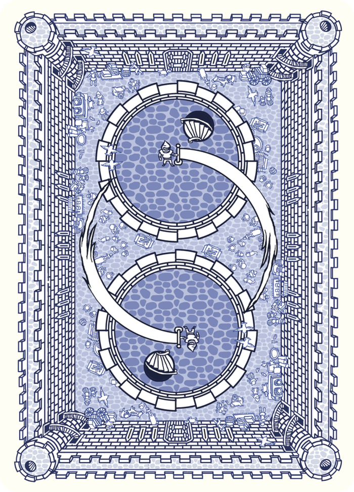 Inspiration for the back design came from the classic Bicycle Rider Back – the 2 main circles, and the larger connecting circle caught Brett’s attention. So with a help of Eleanor Lutz he combined that concept with a castle theme which fits royal animals from this deck – Royals should be in a castle.