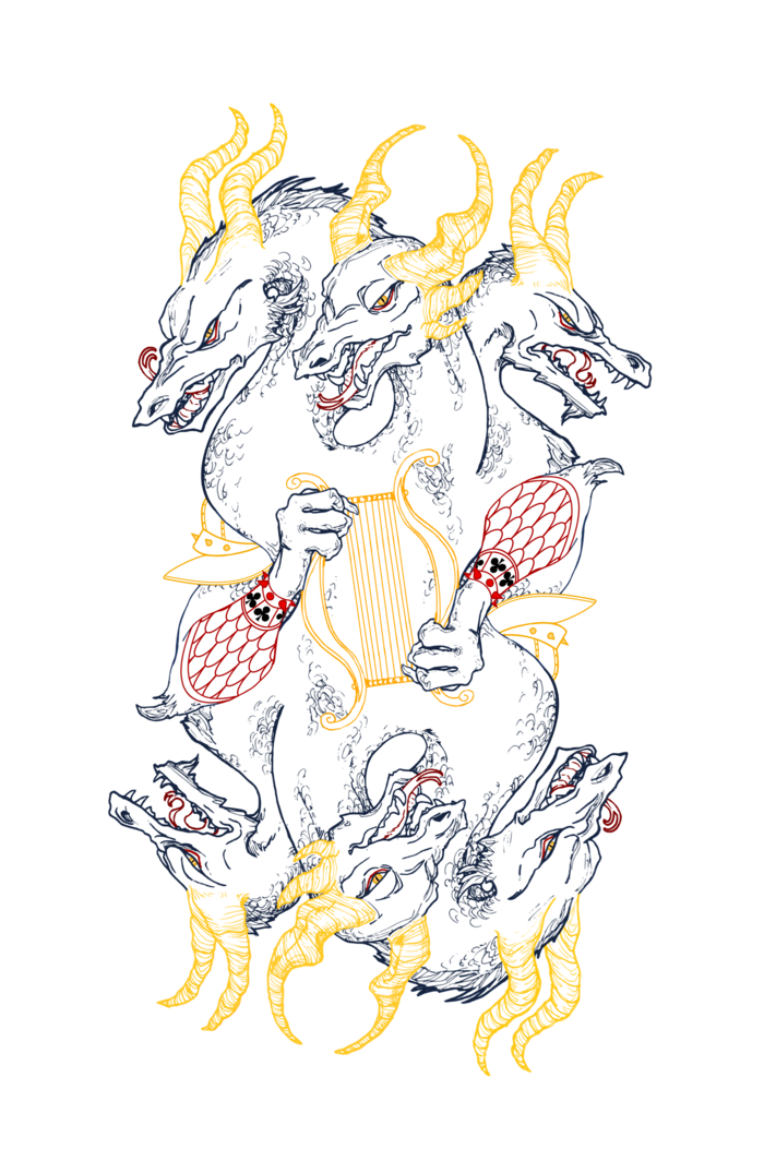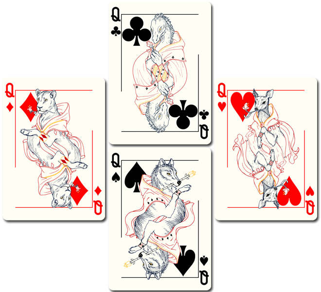 Lions, Dragons, Deer, and Dire Wolves, immortally captured on Bicycle Branded Playing Cards. These animals are at war… This is a set of Playing Cards showing four animal factions, personified as the Court of each Suit. Brett Dudo in collaboration with Anita Birgány (handled the wildlife) and Eleanor Lutz (designed the unusual and very interesting back design) created a concept of this deck. This poker deck is planned to be printed by USPCC.