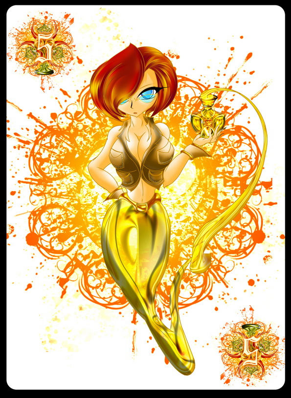 Hachimitsu Ink adore to create Djinns and mermaids (as artworks). So the designer decided to make a deck of playing cards mainly dedicated to them (a project). Playing cards need some additional improvement. The most interesting of them [© Hachimitsu Ink]: