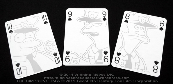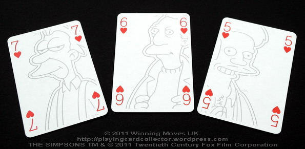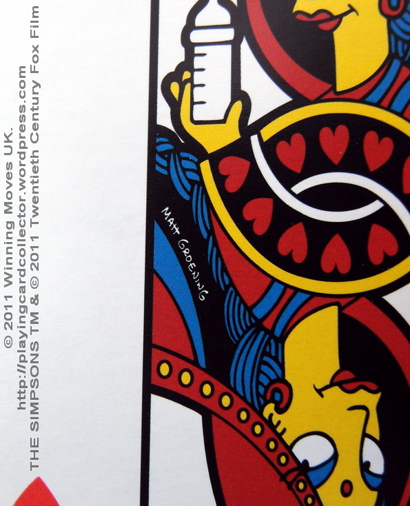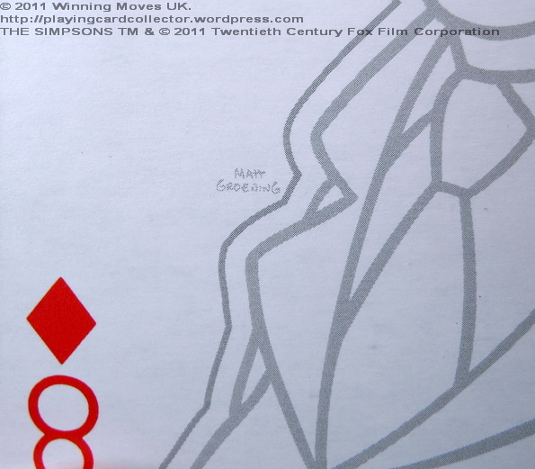 All playing cards have original pictures (Jokers, court cards, number cards) with different characters from The Simpsons series depicted on them. Each picture is signed by Matt Groening. Jokers and court cards have colour pictures and number cards have black (grey 🙂 ) & white pictures. All the artwork was provided by Twentieth Century Fox Film Corporation for Winning Moves UK Ltd.