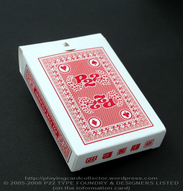 Five main folders of P22’s typographic materials are depicted on the bottom of the box as well as on one of three Jokers (see below). The back of the box has the design of cards backs. It is one way due to pips.