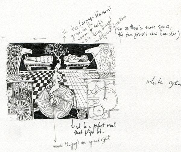 The cyclist guy (in the centre) rotates the pedals of his bike -> The wheels get moving the grotesque heads, which have cogs for eyes and -> Move the wheels of the trick trolley that has two halves of the “sawed woman” -> The “halves” move in opposite directions and get “swallowed” almost completely -> As there opens more space between them, a trick orange blossom tree grows from the hat of the cyclist in the centre.