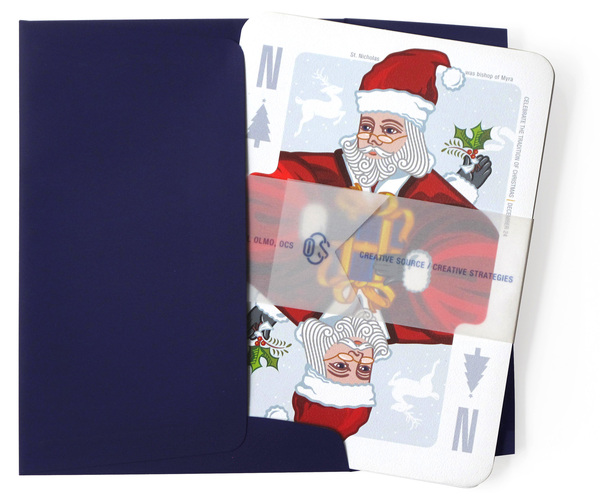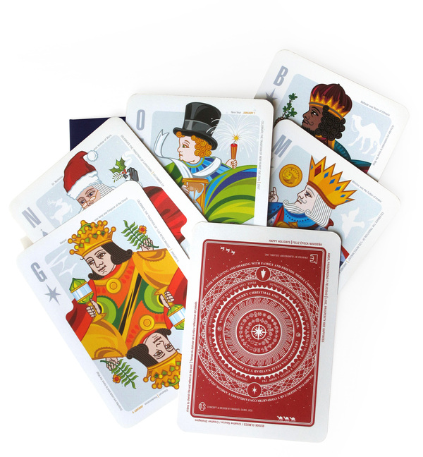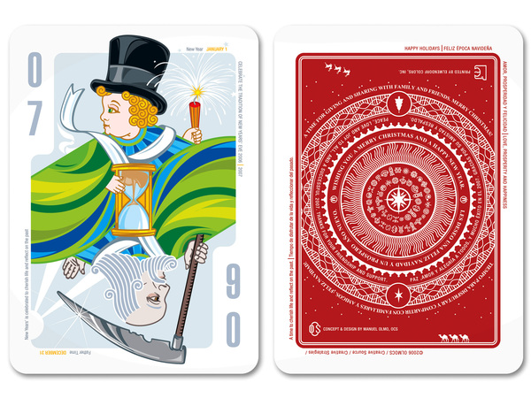 Several playing cards designed by the Puerto-Rican artist Manuel Olmo-Rodriguez as greeting cards for promotional purposes. Manuel was inspired by antique playing cards. Playing cards are based on popular iconic characters from holiday festivities celebrated in Puerto Rico. The first is Santa Claus December 6th and the 24th; then Old and New Years December 31st and January 1st correspondingly; the “Three Wise Men” or ”Three Kings”: Melchior January 7th, Gaspar January 8th and Balthasar January 9th. © 2006 Manuel Olmo-Rodriguez