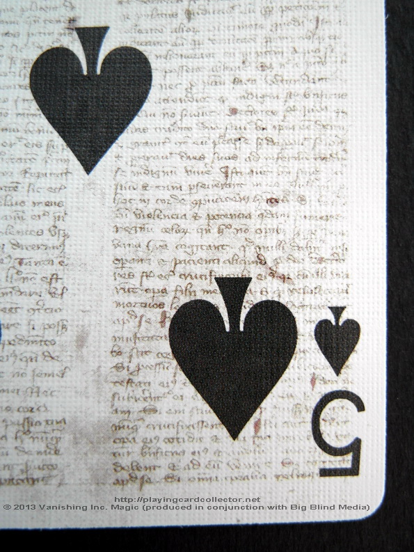 The backgrounds of all playing cards have some calligraphic text. Perfectionism of the producers has its limits as the text on all backgrounds is the same (see tens and the Queen of Spades below). It is probably a page from the book. On the other hand the book was written in archaic Early Modern English and I doubt a lot of people will enjoy such reading :). Also the text is almost unreadable because of its small print. This text turns all playing cards into symbolic pages of this book. Stylish.