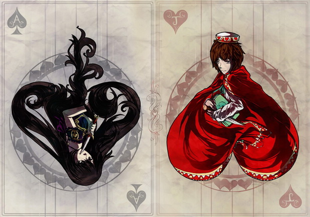The Ace of Spades and The Jack of Hearts designed by the Canadian artist crystal-infinity (nickname). Interesting incorporation of pips into the design of court cards.