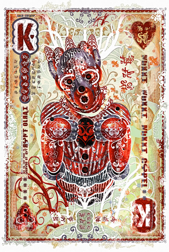 Kristian Olson is an American illustrator, designer and fine artist living in Los Angeles, California. He has unusual and exuberant style based on years of experimentation with both digital and traditional media. These are several Olson’s artworks inspired by playing cards. Some of his artworks were included in Ultimate Deck by Stranger and Stranger.