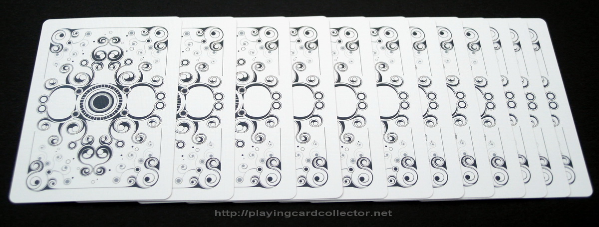 The deck: 52 playing card + 2 slightly different Jokers + 1 blank card + 1 double backer. Poker size. 2500 decks were printed by USPCC (presumably Bicycle stock, Air-Cushion finish). Playing cards have custom pips and indices. Court cards are quite seriously redesigned Arrco standard court cards. The pictures of the tuck case are clickable: