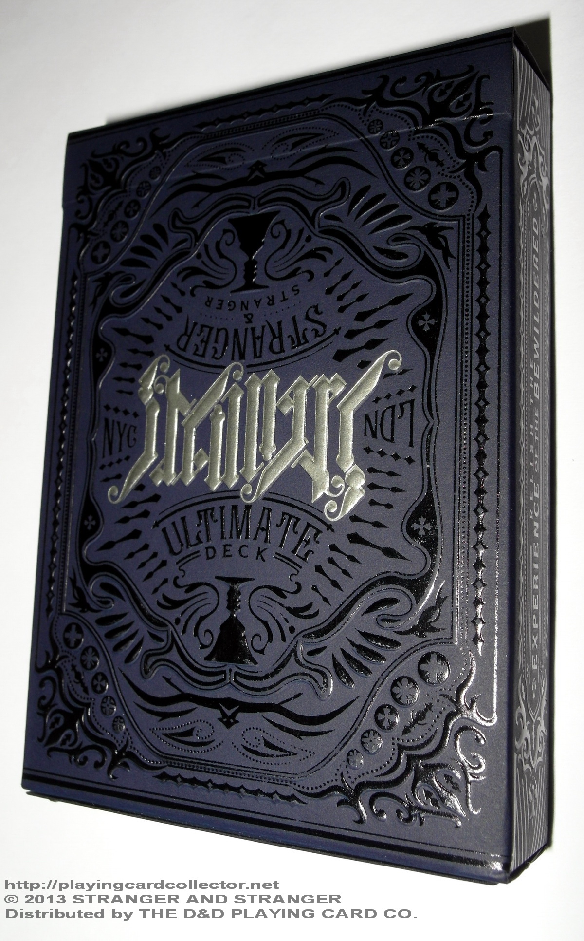 The bottom part of the tuck case is also full of designed elements. Inscriptions on it made with silver ink say “STRANGERANDSTRANGER.COM”, “Designed by Stranger & Stranger New York & London”, “Distributed by The D&D Playing Card Co. Hollywood, CA 90028”, “Made in USA”.