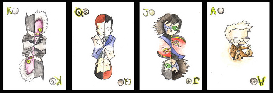 These are Batman playing card artworks created by a British artist, Thomas Hope (Mr Hope or misterhope). Such a funny project dedicated to Batman. Traditional suits are substituted with coins, paws, icicles, and leaves.