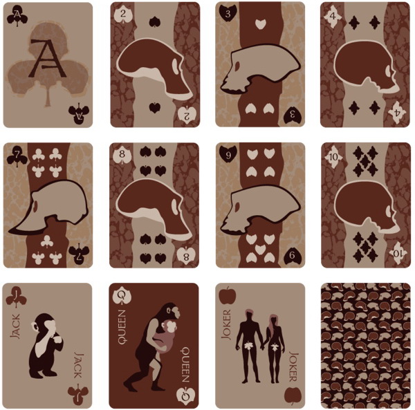 Katie Ann Chan chose the Evolution of Man as the theme for her Evolve Playing Cards (project). She displayed the progression of man on the suits. Different skulls were used to represent each stage of Man. Katie abstracted the skulls to create the suits for these playing cards and used a neutral color palette derived from flesh tones to underline her concept. Textures were applied to the solid background for a more humanistic bone consistency.
