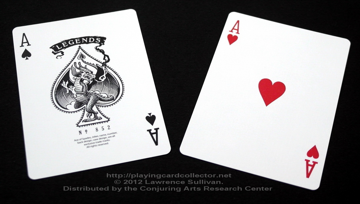 The Ace of Spades is custom and has a dragon encapsulated in the Spades pip who spouts fire forming the name of the playing cards. The dragon stretches its wings and its tail has a shape of the Spades pip (like two dragons on the coat of arms). “No. 852” (the number of the decks) and copyright warnings there are under the picture. The pip is covered with dragon’s scales.