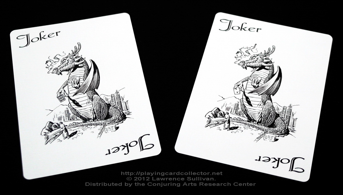 Jokers show a dragon puffing some smoke and playing cards with a person. Both are in the outskirts of… Hong Kong, I guess. The person is presumably on his way to the city. And, as I understand, the dragon guards a road. Look at his tail. The person should win some playing card game to be able to visit the city.