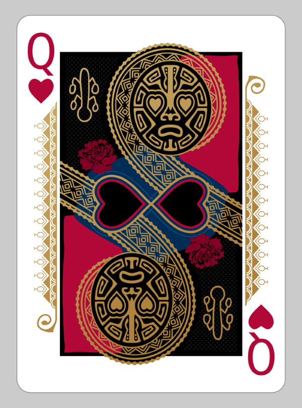 Different Polynesian tribal masks are depicted on court cards (Make-Make on the King of Hearts). Ladies are so feminine that they have got flowers to be additionally identified 😉 Men are warriors and have appropriate equipment. Each court card has its own rongorongo glyph.